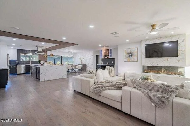 Stunning Fully Renovated 3 Bed / 2 Bath home located in highly desirable area! Open Concept layout designed with exceptional attention to detail & high end finishes. No interior steps! Dramatic sliding wall of glass creates an effortless indoor-outdoor living space. The fabulous kitchen makes a statement of its own with the gorgeous island & elevated lighting. Accented by an entertainment bar & walk-in pantry. You'll love the primary suite, boasting direct outdoor access, a 2nd fireplace, a walk-in closet, & a lavish bath with soaking tub & rainfall shower. Two additional bedrooms (all with access to the backyard) makes this such an inviting home! Lastly, the quaint backyard includes a patio area with a lovely pergola, BBQ Area & a fire pit!