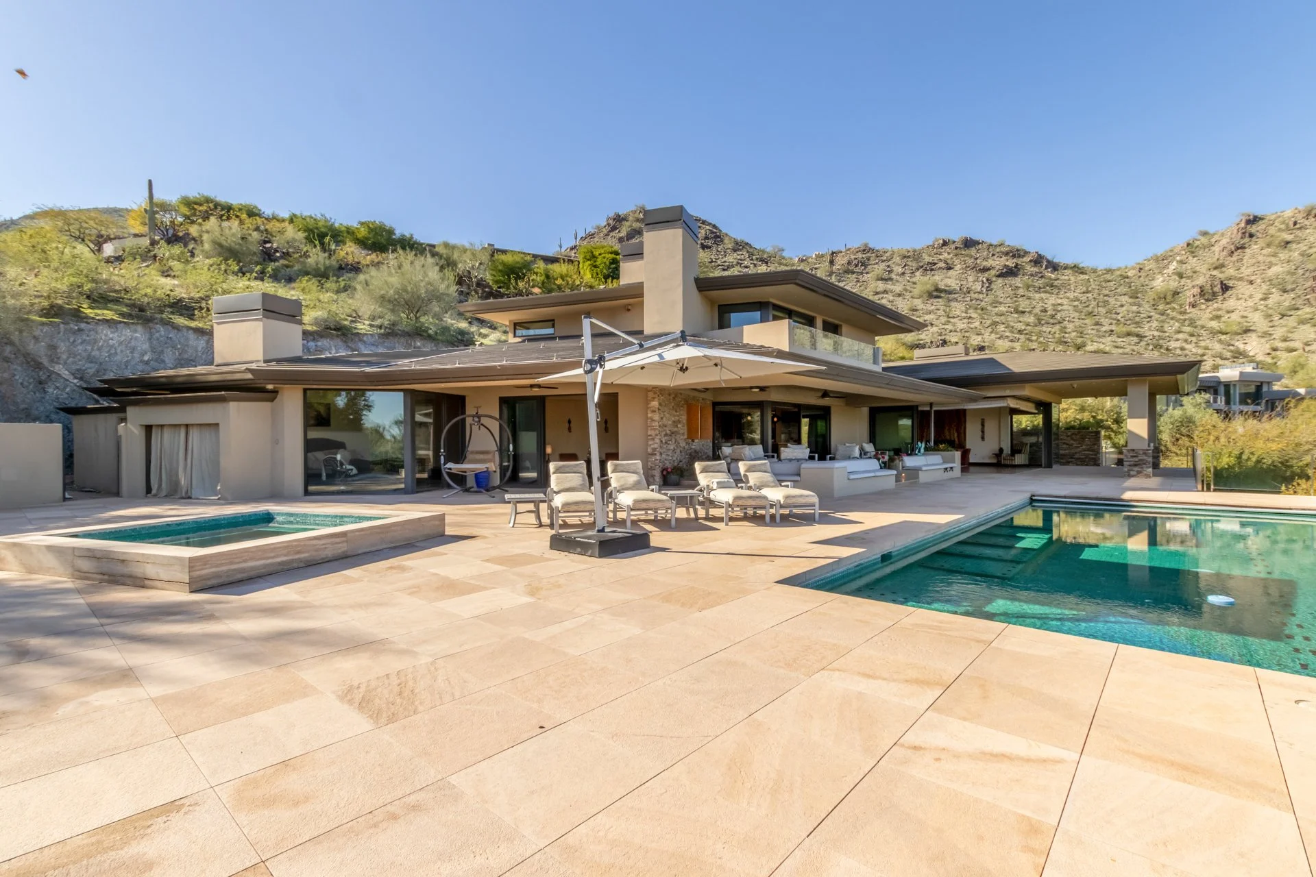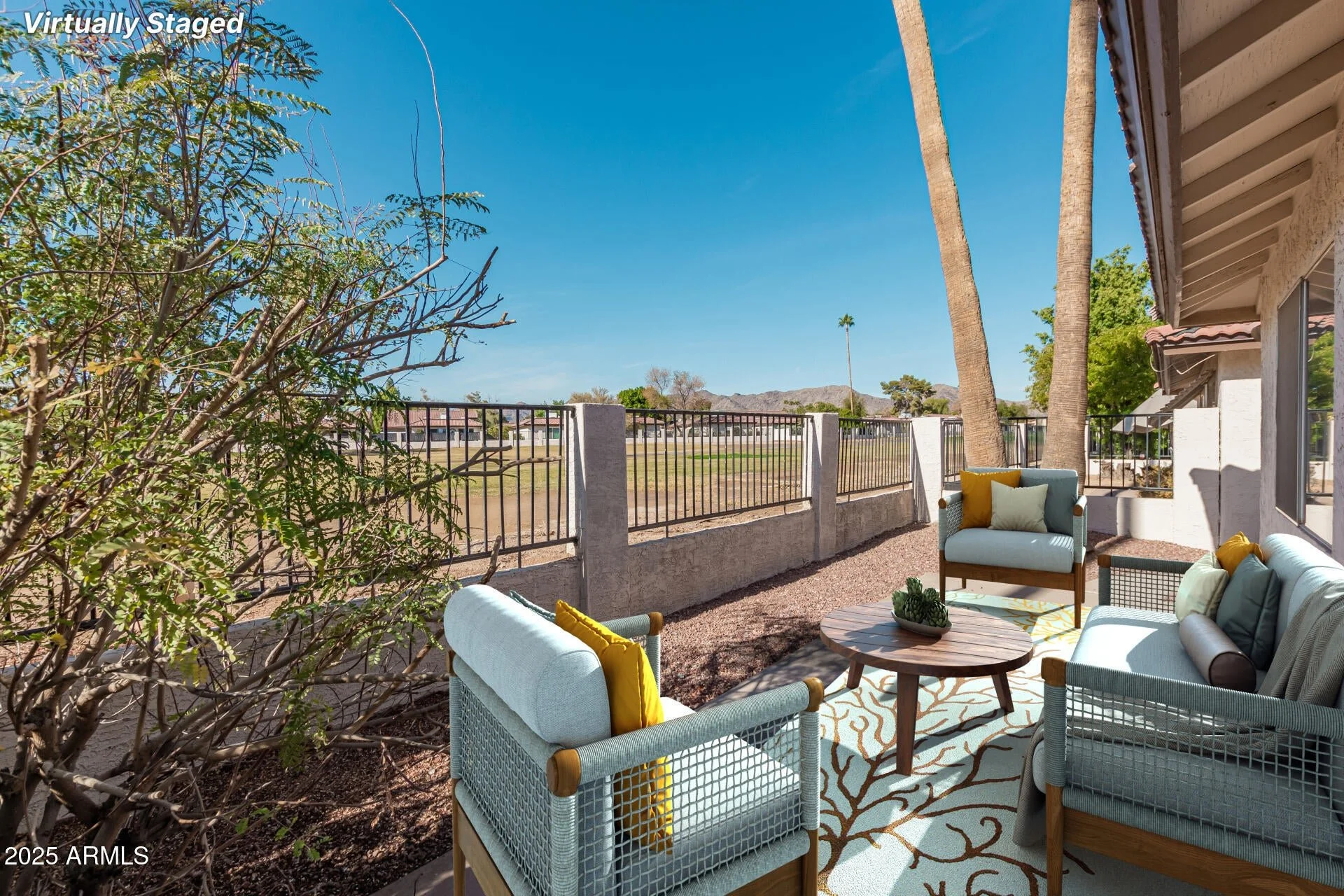 This stunning single level home in gated Talinn located near City North, Desert Ridge Market Place , the 101 and 51 Freeway. Great room open floor plan! 4 bedroom , 3 bath split plan, fifth room for additional office or bedroom (w/ door). Huge yard w/ mountain views & private wash behind! Gourmet kitchen is a chef's dream, featuring stainless steel appliances with wall ovens, neutral cabinetry, Quartz counters, tile backsplash, and a center island with a breakfast bar. Retreat to the main bedroom, complete with a private ensuite boasting dual sinks and a generous walk-in closet & custom molding. Explore outside to the serene backyard, where a covered patio, cozy sitting area, turf grass and low maintenance yard is a plus! Enjoy Community pools and nearby parks!